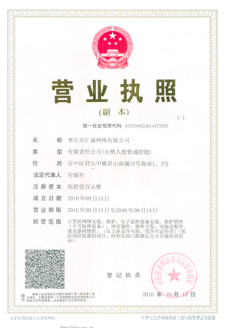 特提供三證合一后的新營業(yè)執(zhí)照副本如下 棗莊市匯誠網(wǎng)絡(luò)有限公司營業(yè)執(zhí)照(統(tǒng)一社會信用代碼:9137040256144770XY)